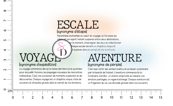 Dimensions : [ESCALE] 6,5 x 3,1 cm / [AVENTURE] 6,2 x 3,1 cm / [VOYAGE] 6,3 x 3,1 cm
