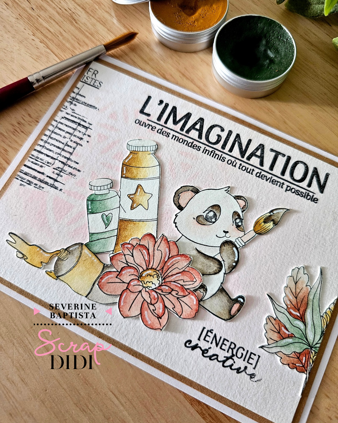 Aujourd’hui, je vous propose une carte scrapbooking panda 🎀, réalisée avec la superbe collection “Au pays des artistes”.
