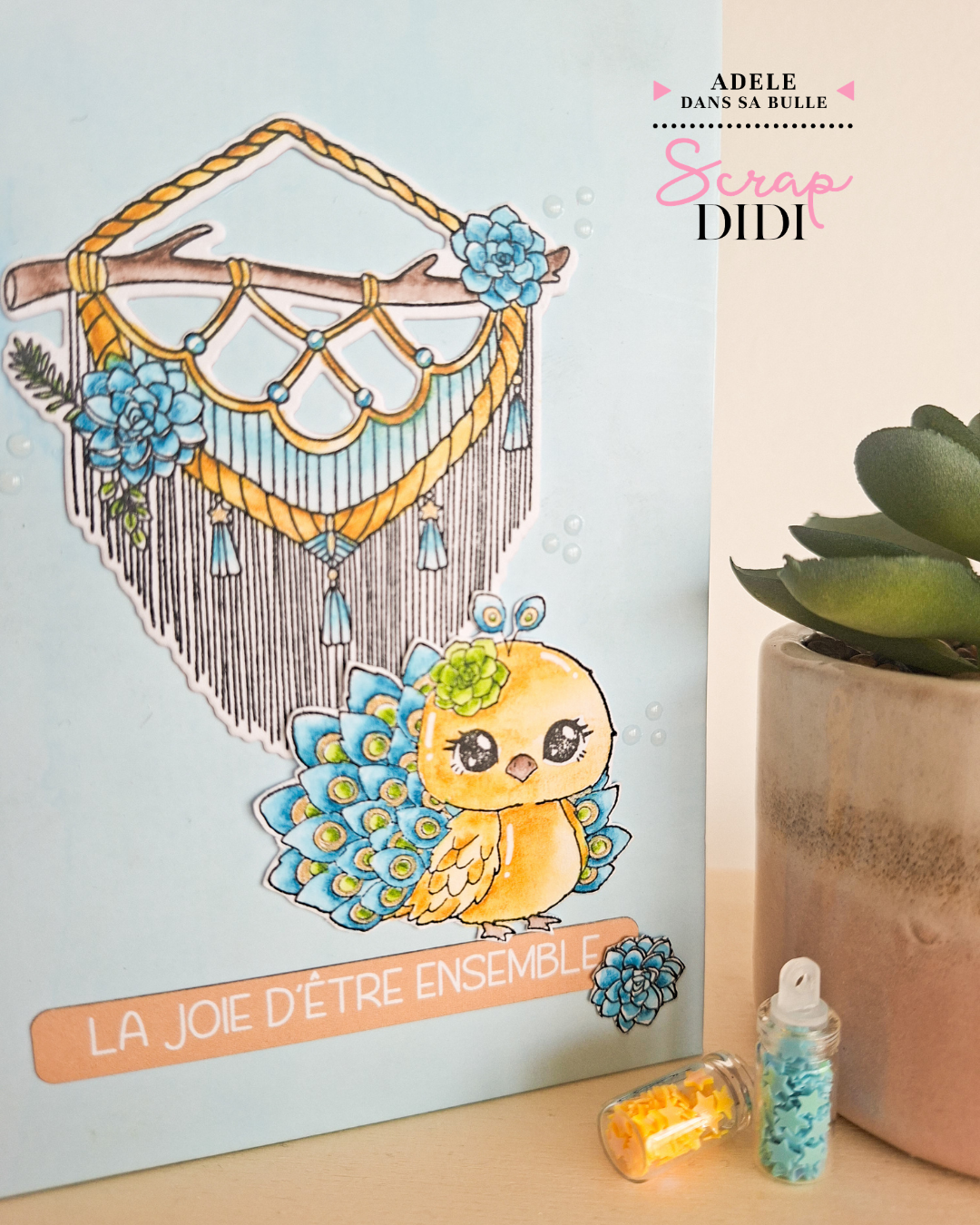 Le duo tampon et die « macramé bohème » ainsi que le paon bohémien ont été utilisés pour décorer la couverture. Ces motifs apportent une identité forte et élégante à la création.