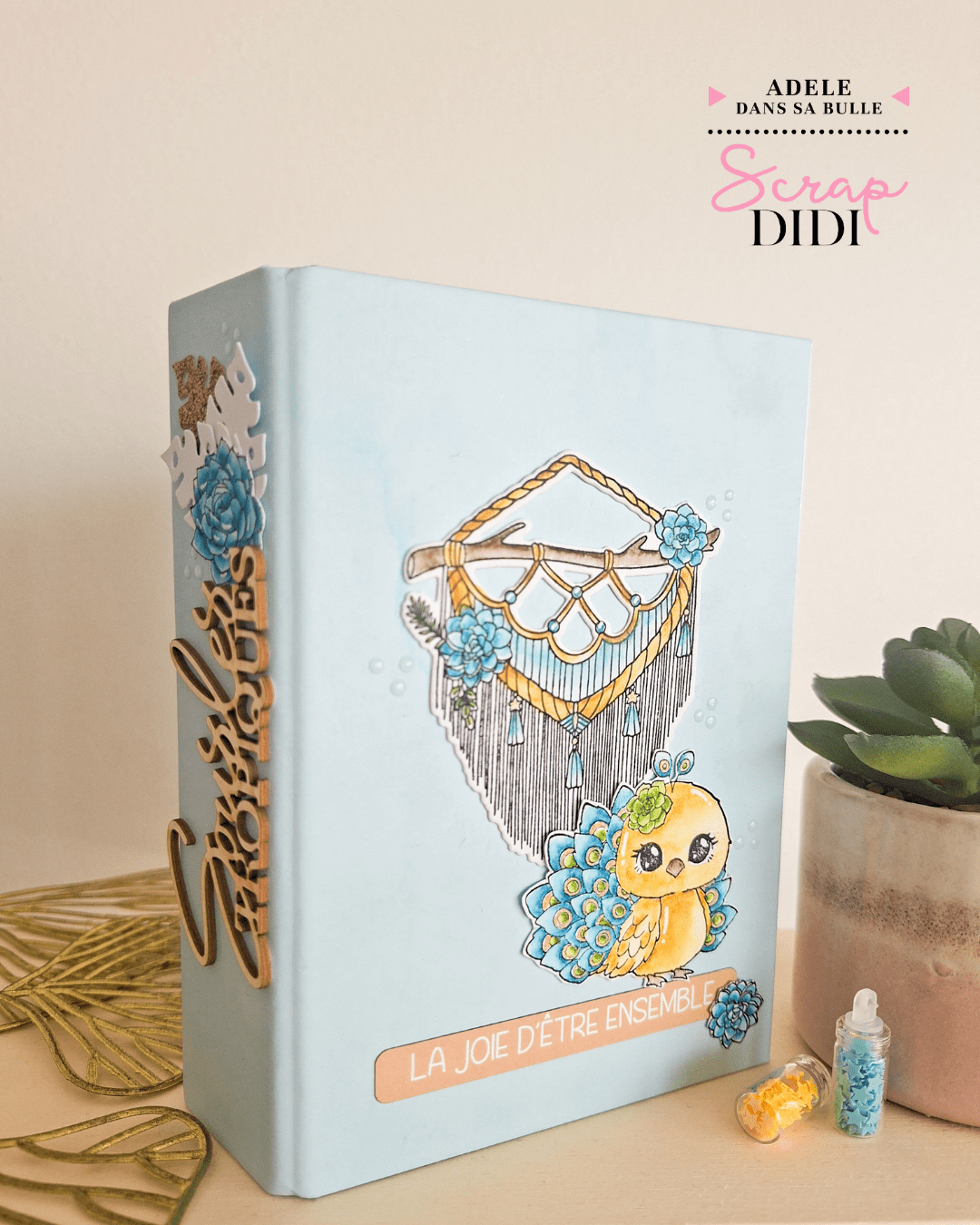 La tranche du classeur a également été décorée avec un mot en carton bois, des tamponnages et quelques découpes. Cette attention permet d’obtenir une création harmonieuse jusque dans les moindres détails.