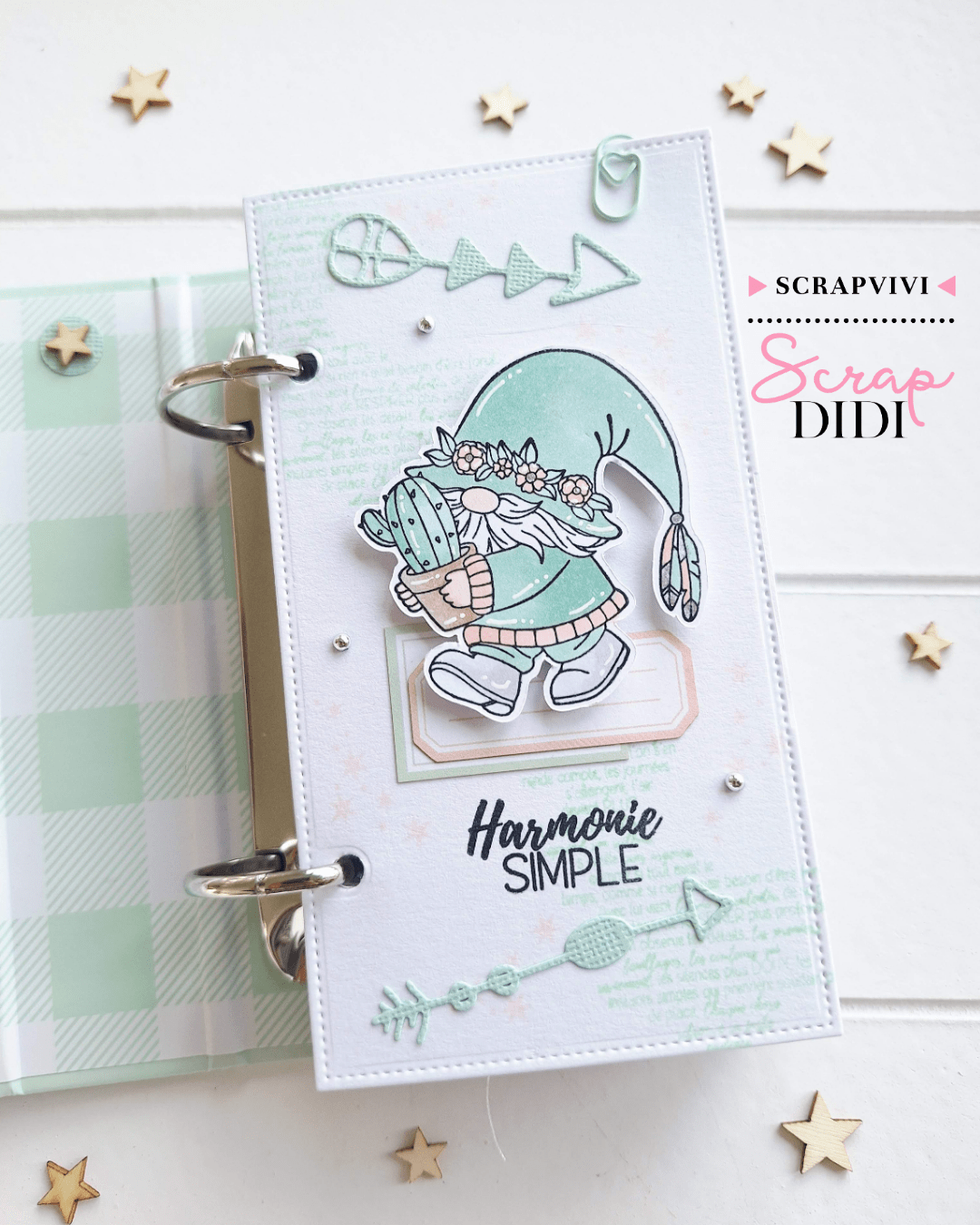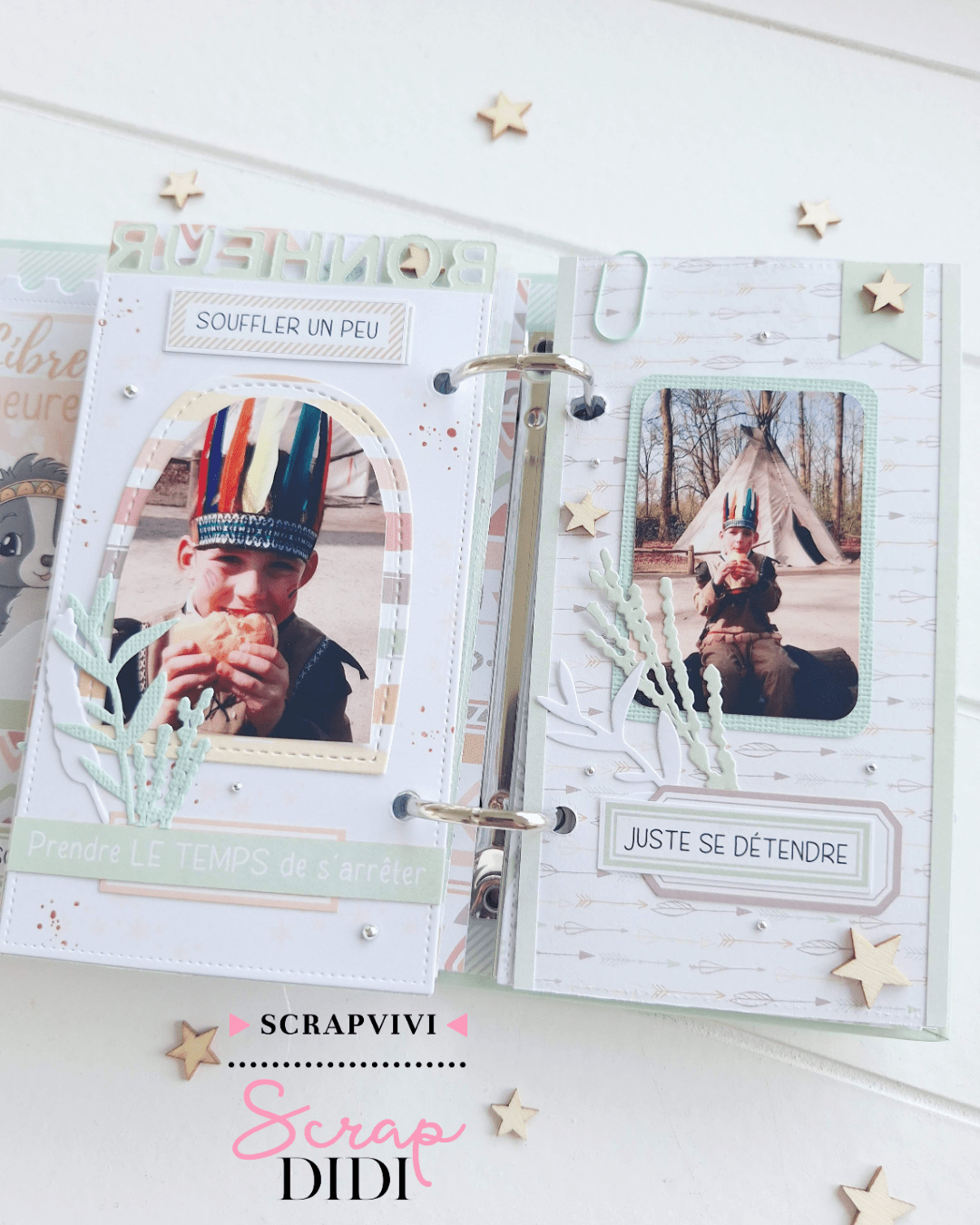 Les pages du classeur ont été réalisées avec les papiers de la collection Rêveries Bohémiennes, ainsi qu’avec les nouveaux dies et les pochettes transparentes. L’ensemble crée un univers doux, naturel et harmonieux.