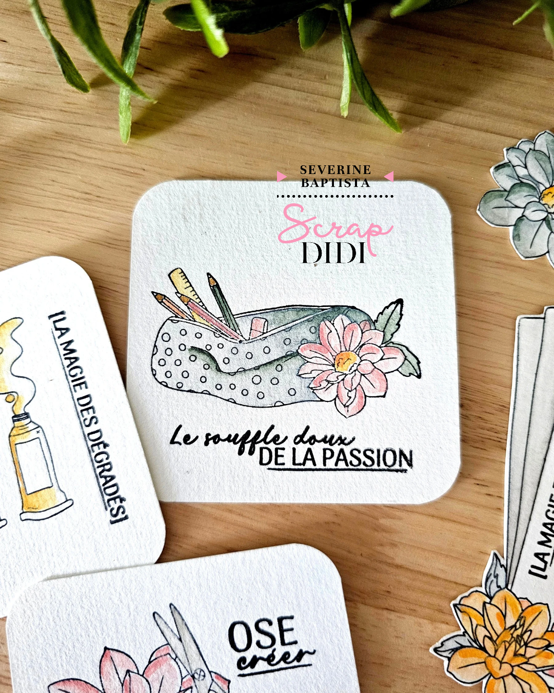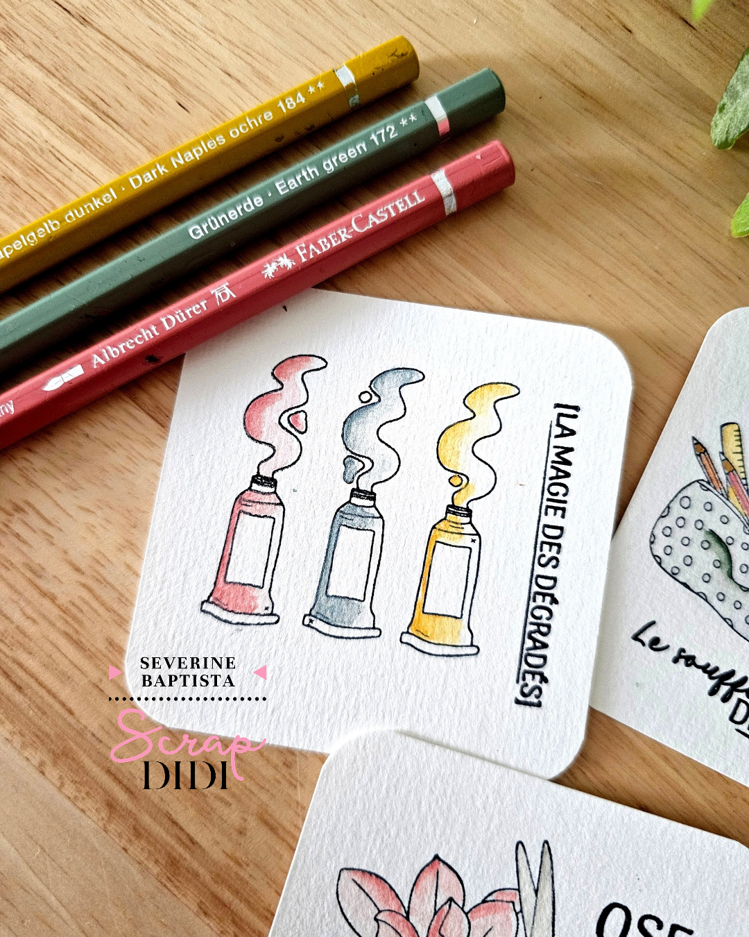 Pour cette série, la collection Au pays des artistes a été mise à l’honneur. Son univers créatif et expressif se prête parfaitement à ce petit format et permet de composer des cartes pleines de personnalité.
