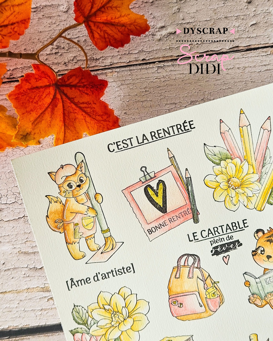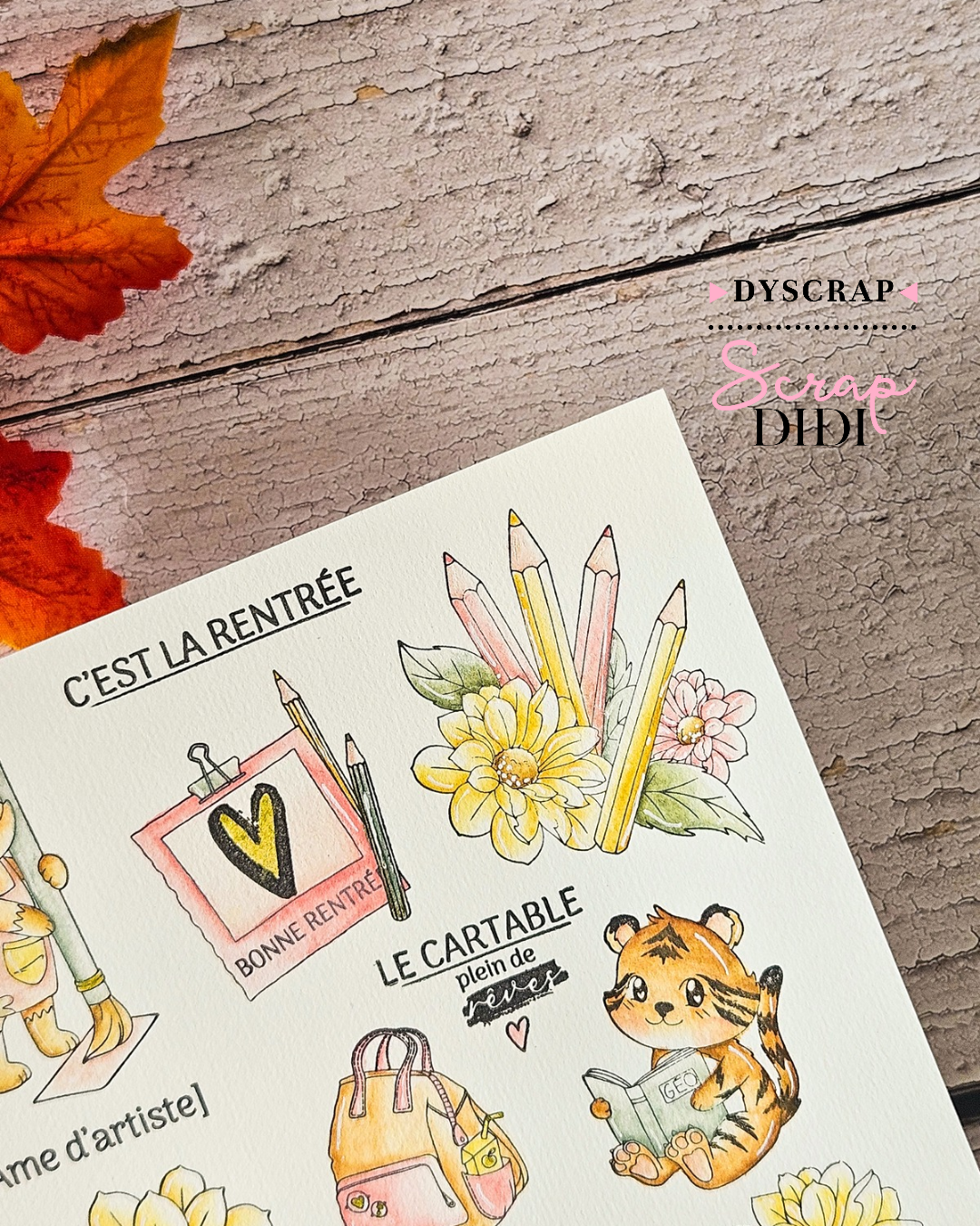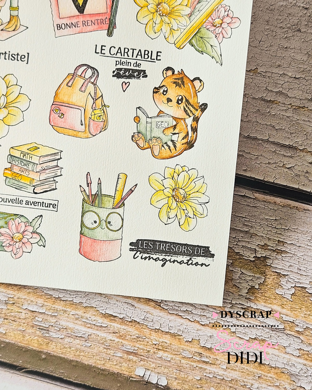 Le format choisi est 21,5 cm x 17,5 cm, parfait pour être intégré dans mon album "Raconte-moi", destiné à documenter les souvenirs marquants de la vie de famille. Cette planche illustrera joliment la rentrée scolaire de ma fille.