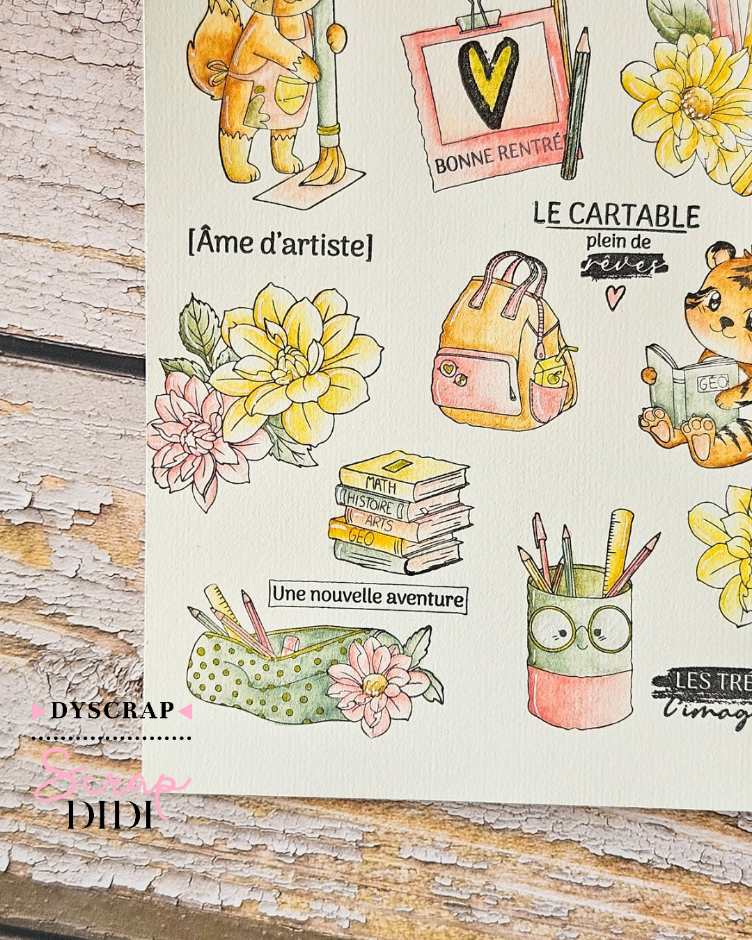 Pour la colorisation des tamponnages, j’ai utilisé les crayons aquarellables Albrecht Dürer, en m’inspirant du combo de couleurs proposé par Scrap Didi pour cette collection. Cela permet de créer une cohérence visuelle et d’anticiper les prochaines créations autour du même univers.