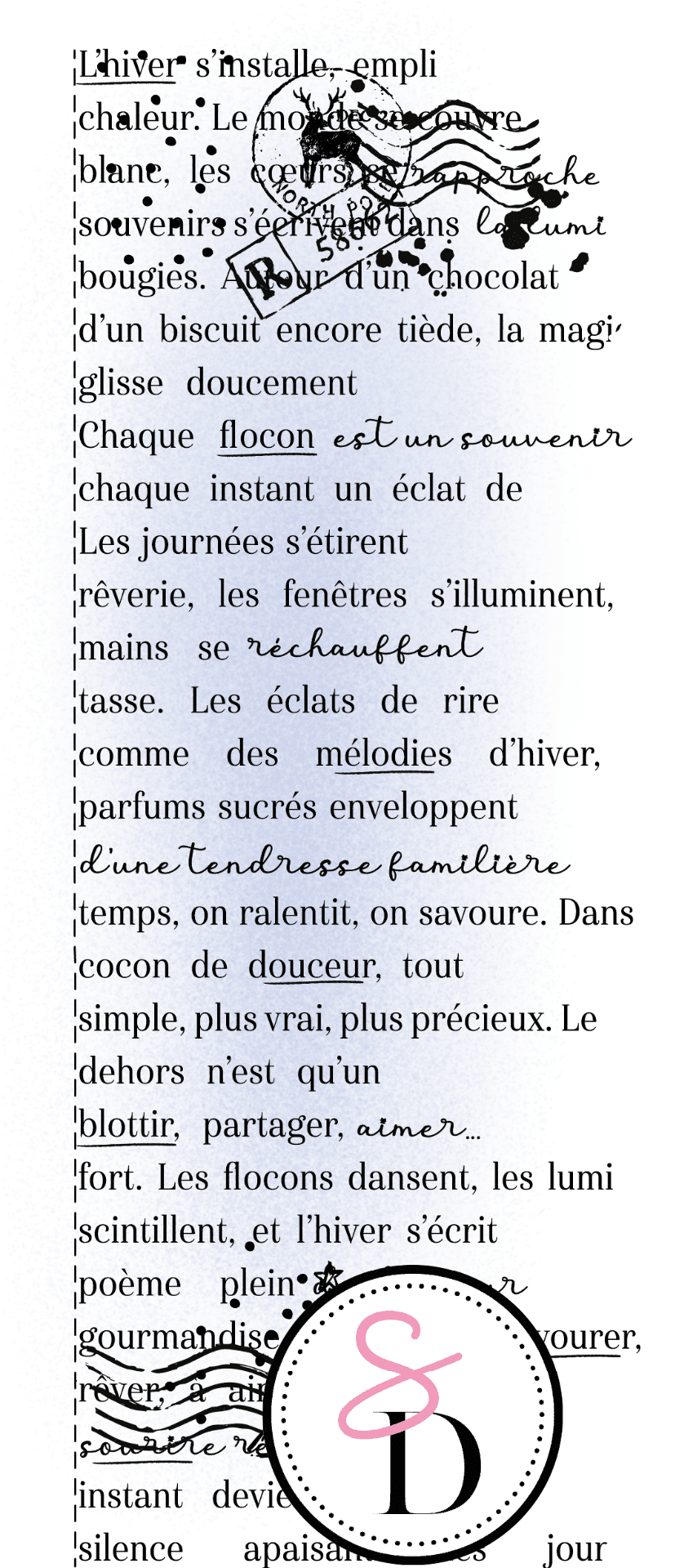 Pour le fond de page, j’ai utilisé le nouveau tampon fond de texte : il est parfait pour ajouter une texture légère et élégante, tout en restant discret. Les tampons décoratifs ont ensuite été colorisés aux crayons aquarellables Albrecht Dürer, pour un rendu lumineux et coordonné aux papiers.
