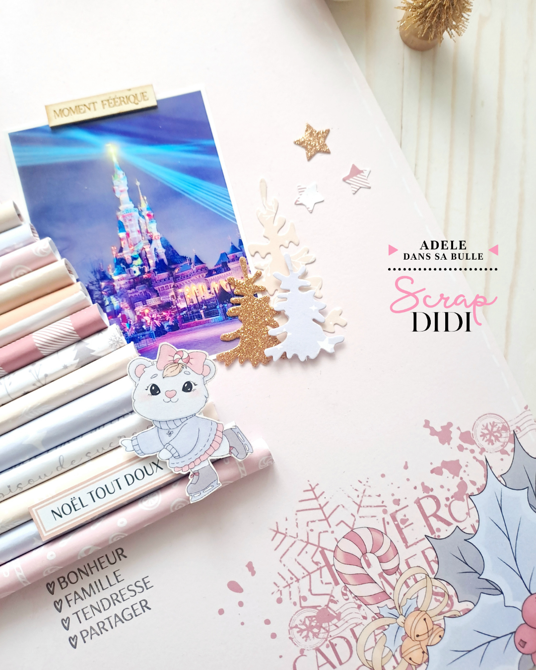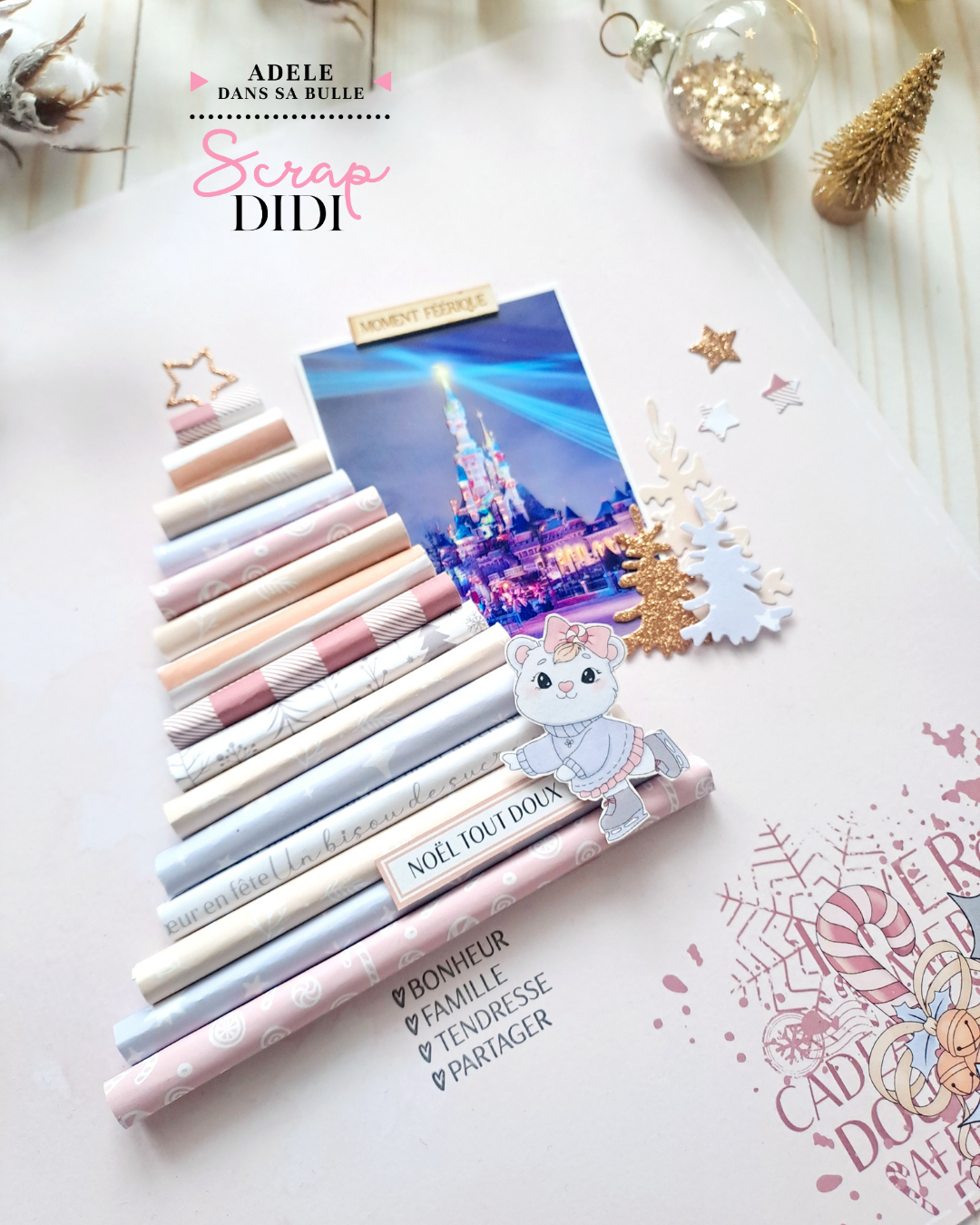 J’ai adoré créer cette page scrapbooking de Noël, pleine de rose, de douceur et de lumière 🎄 Les couleurs pastel de la collection “Douceurs d’hiver”, les étoiles, le doré et les touches brillantes rappellent tellement cette période magique où Noël approche à grands pas ✨