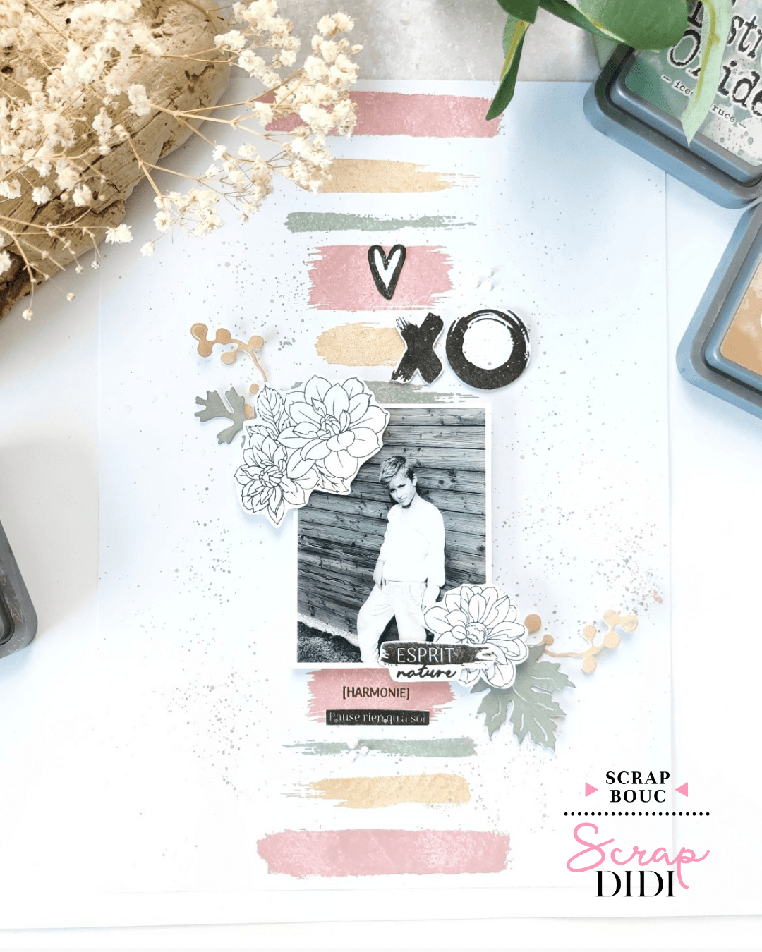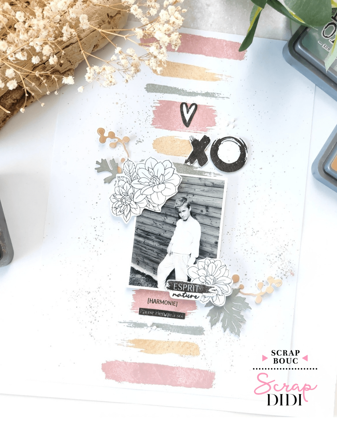 Aujourd’hui, je vous partage une page de scrapbooking texturée, réalisée avec la nouvelle collection Scrap Didi. Mon gros coup de cœur va aux planches de tampons clear “Tâches” et “Les couleurs de la nature”. Ces deux planches sont infiniment modulables et permettent de créer des fonds dynamiques et originaux.