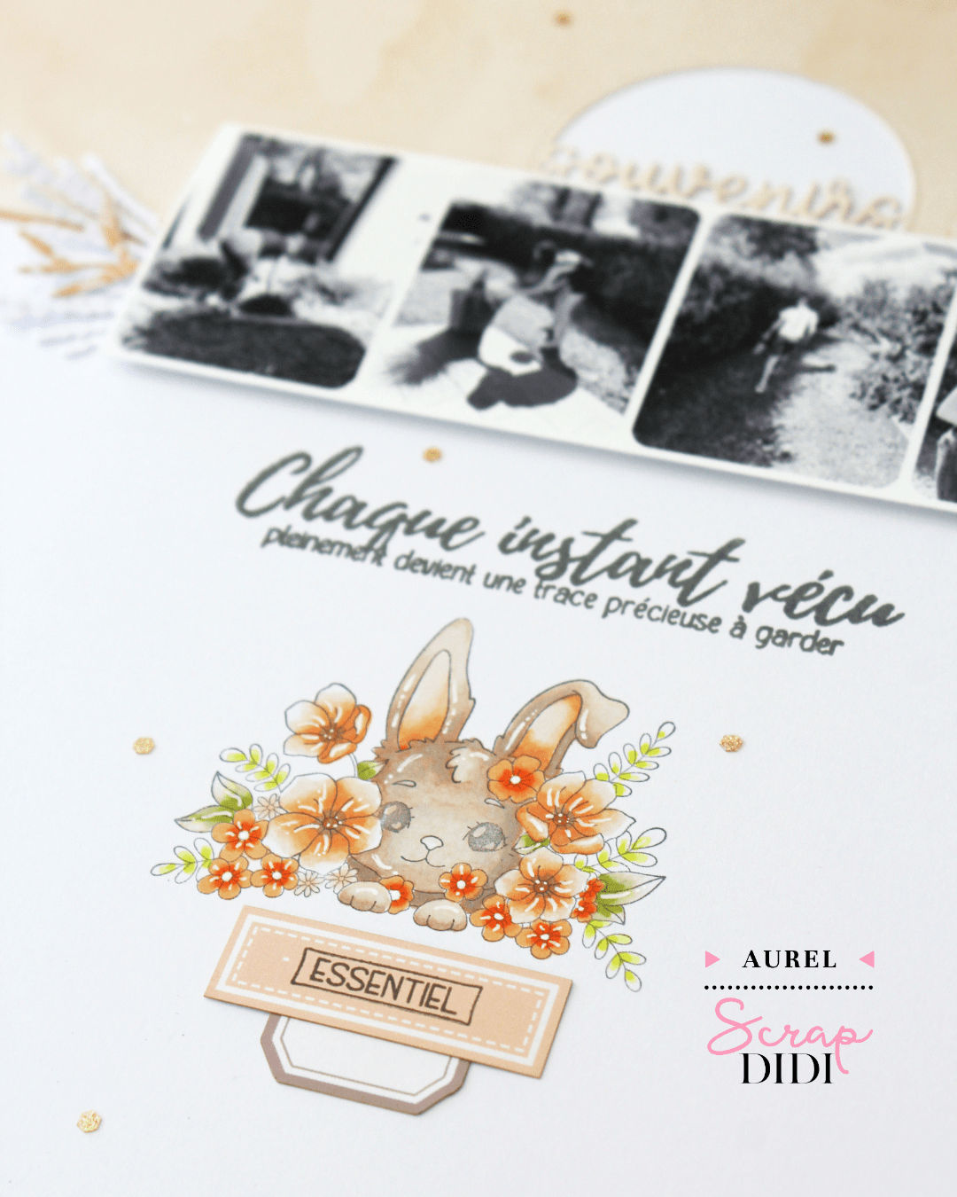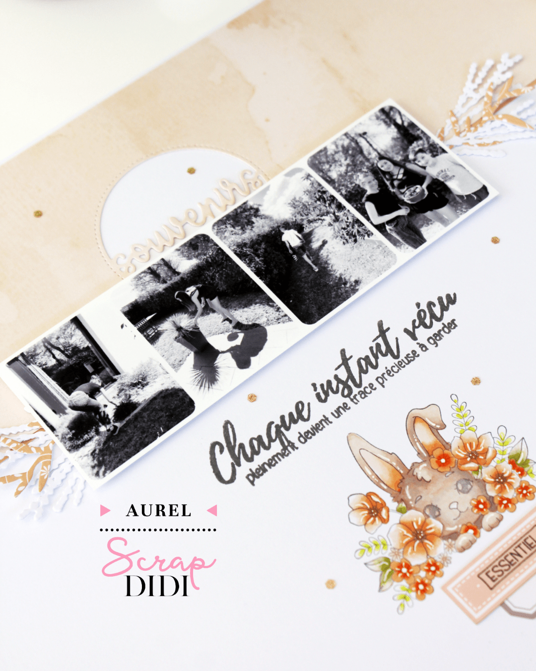 Sous la bande de photos, des feuillages de la collection ont été ajoutés pour renforcer l’ambiance naturelle. Un grand texte issu du set « Un instant suspendu » vient apporter du sens et raconter l’instant capturé.
