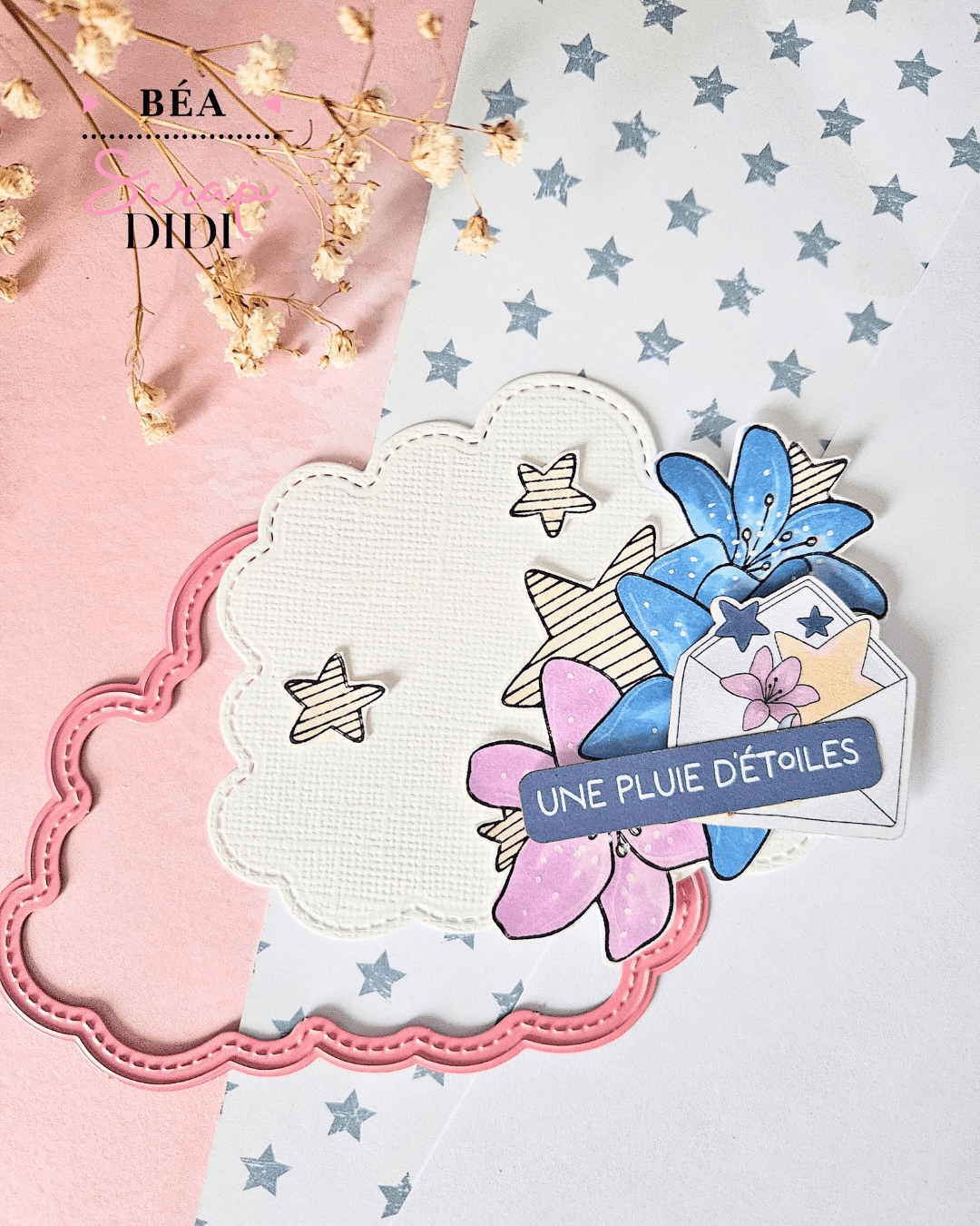 Les deux étoiles du tampon “Lys étoilé” ont été détournées de leur usage initial pour être disséminées sur une découpe nuage issue du set de matrices “Poussière d’étoiles”. Cette répétition renforce l’ambiance céleste et dynamique de la composition.