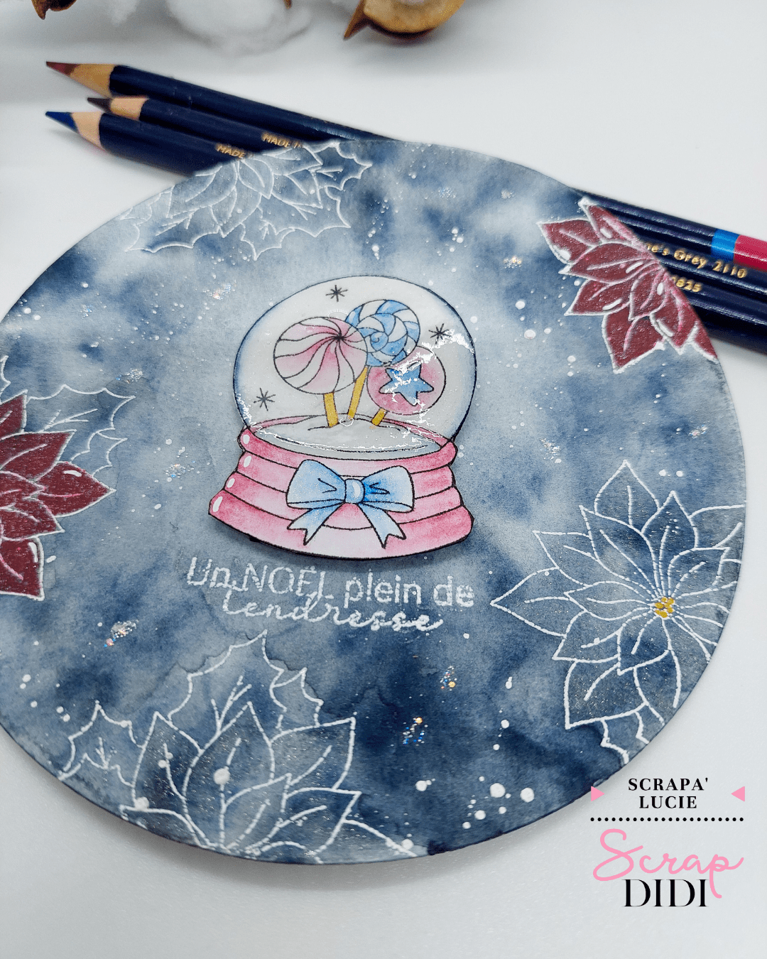 Sur une chute de papier aquarelle, j’ai tamponné la boule de neige puis je l’ai colorisée aux Derwent Inktense (0530, 0825, 2110).