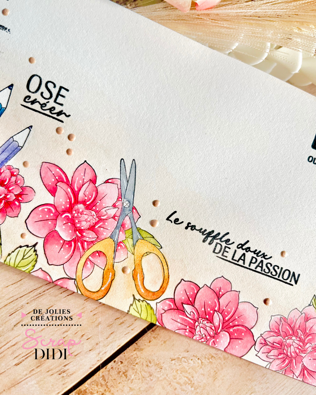 Une composition lumineuse où se mêlent fleurs aquarellées, matériel d’artiste et petites phrases inspirantes comme “Ose créer” ou “Le souffle doux de la passion”.