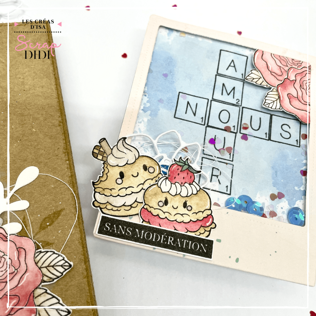 Pour la carte, j'ai coupé du papier kraft en enlevant 0.3 mm en largeur et en hauteur, je n'aime pas trop laisser quand je matte, je trouve que 3 mm c'est parfait. J'ai ensuite pris un morceau de chute du papier 01 de la collection atelier d'artiste, là aussi j'ai enlevé 0.3 mm en hauteur, en largeur j'ai pris 5 cm mais je suis venue l'arracher.
