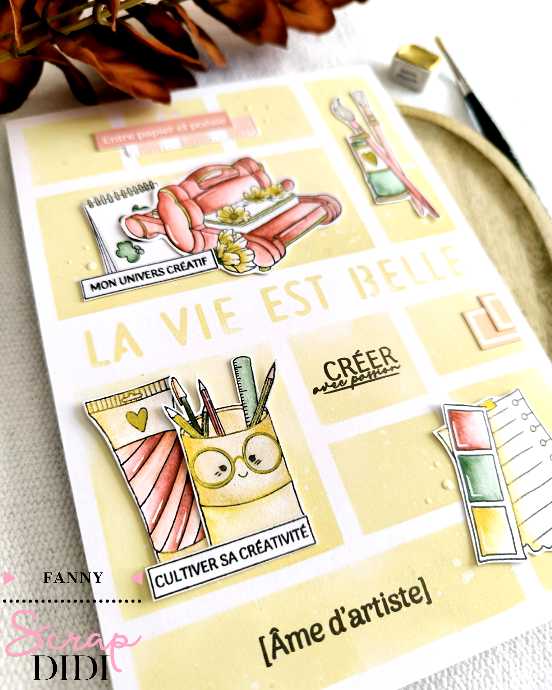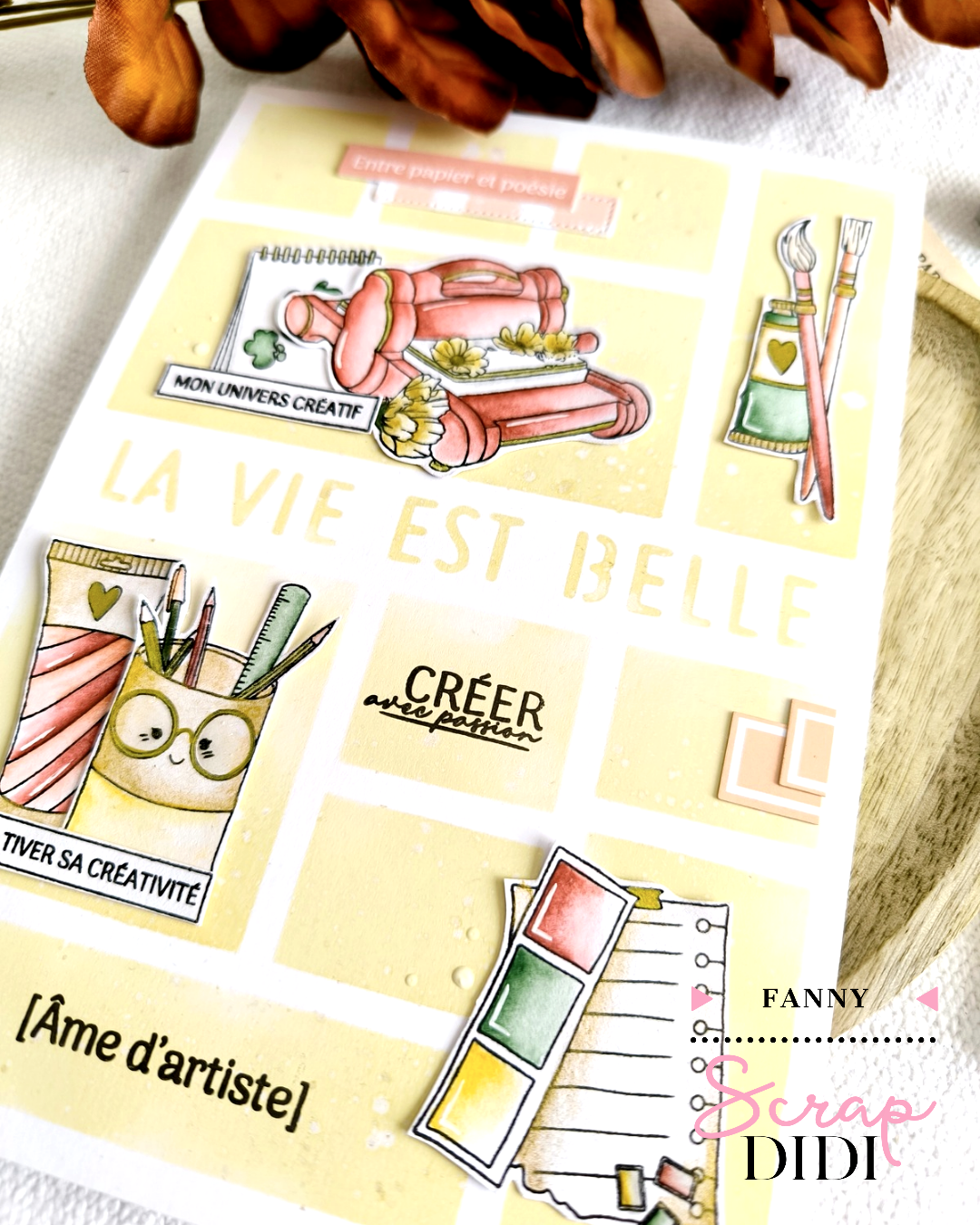 Ce moodboard scrapbooking est une invitation à la douceur et à l’expression artistique. Un univers 100 % inspiré du thème “artiste”, mêlant machine de découpe, pot à crayons, pinceaux et nuancier. Une création pensée comme un hommage à l’atelier, à la couleur, et à la magie du fait main 🎨