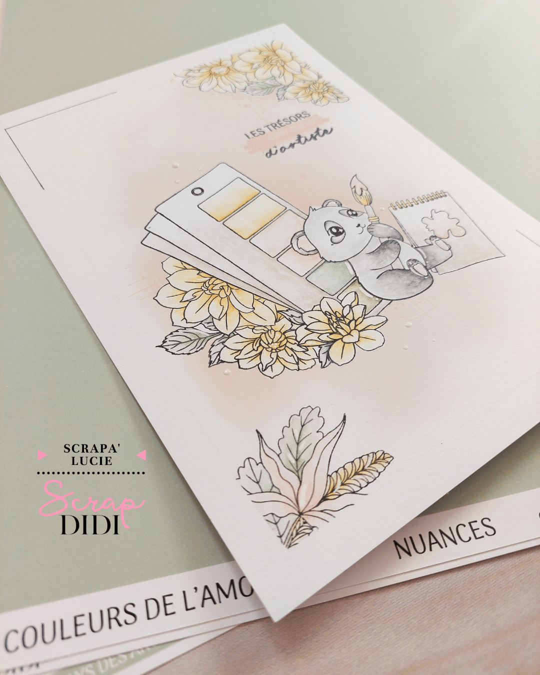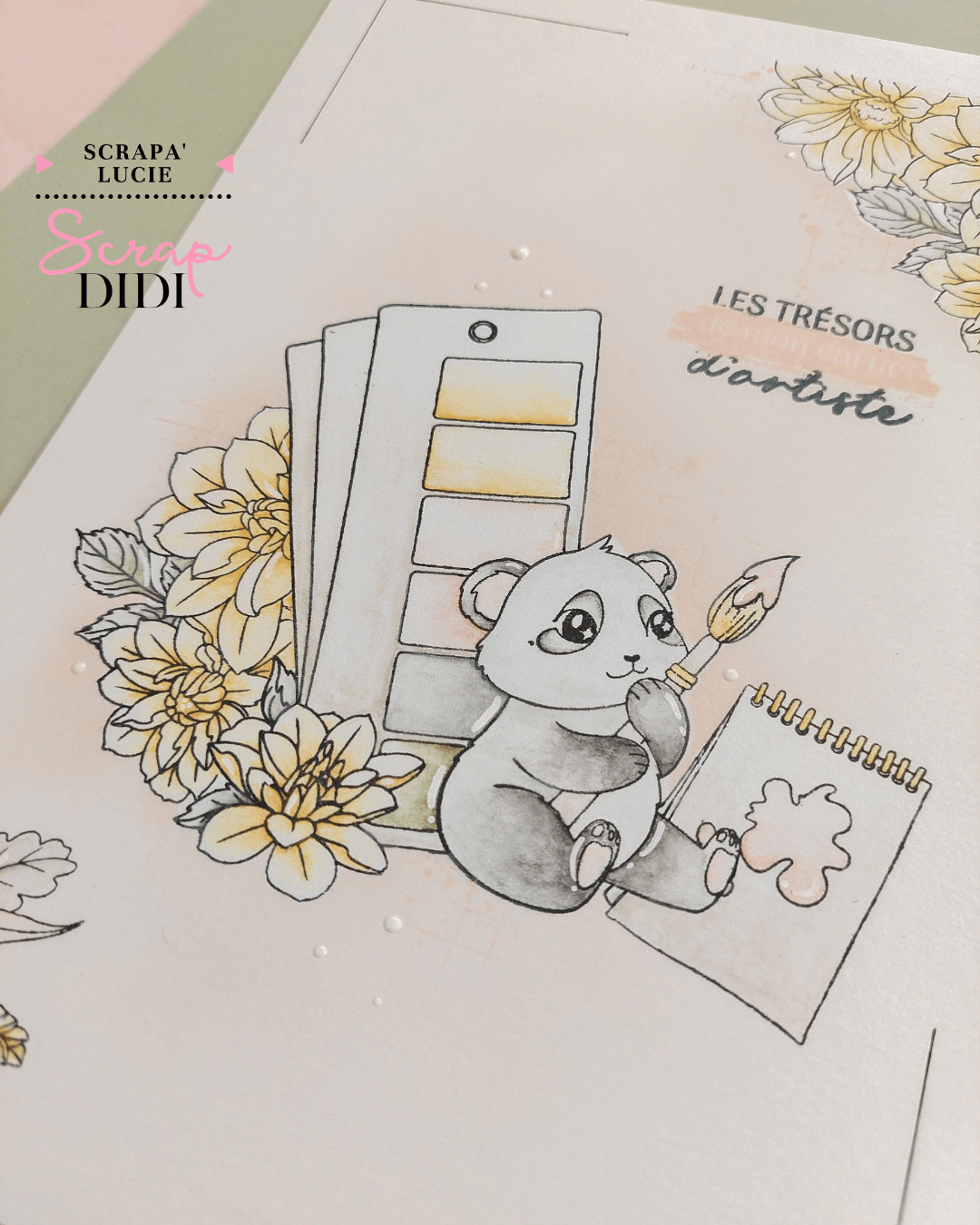 Dans cette création, j’ai souhaité mettre en scène les jolis tampons de la collection “Au pays des artistes”. Leur finesse et leur poésie m’ont tout de suite inspirée pour donner vie à une page de carnet légère et colorée, parfaite pour exprimer ma créativité.