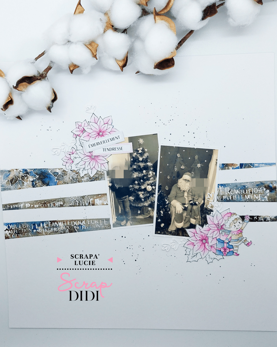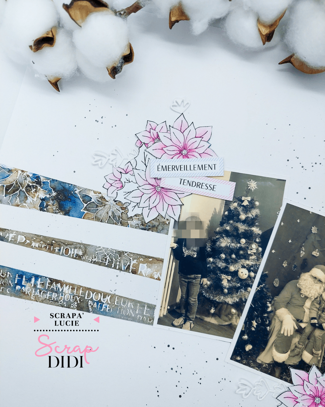 Pour cette page de scrapbooking, j’ai choisi deux photos à mettre en scène autour d’une superbe fleur de poinsettia, symbole parfait de Noël.