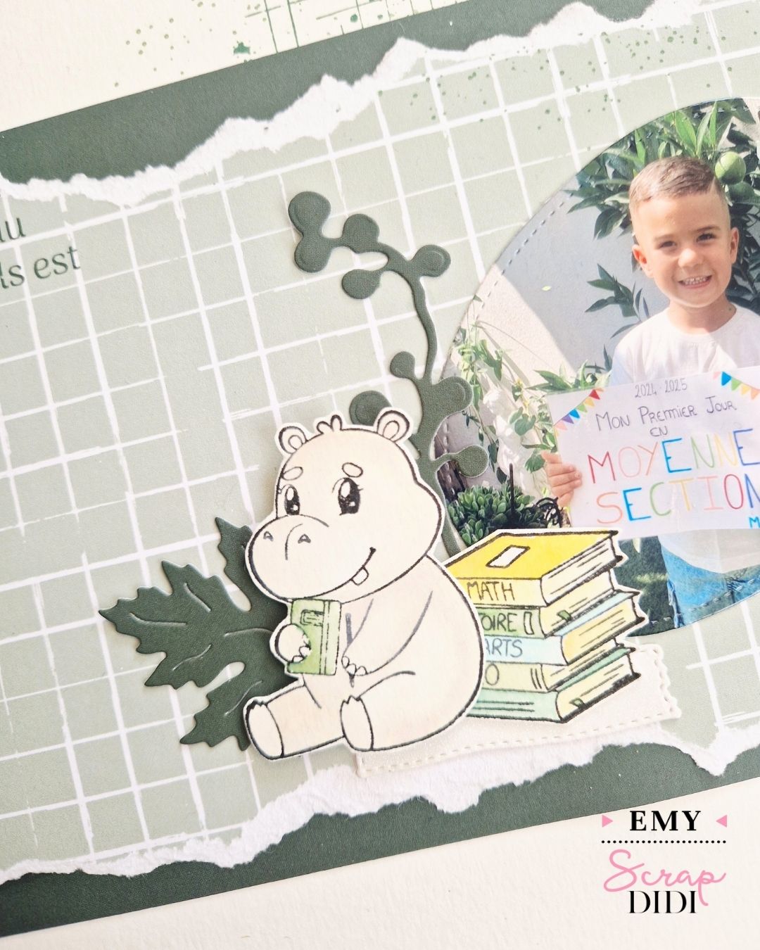 Pour un effet unique, j’ai découpé la photo avec le die duo de palettes, ce qui apporte une touche originale et thématique à la mise en page. Une idée parfaite pour personnaliser vos pages artistiques ou scolaires !