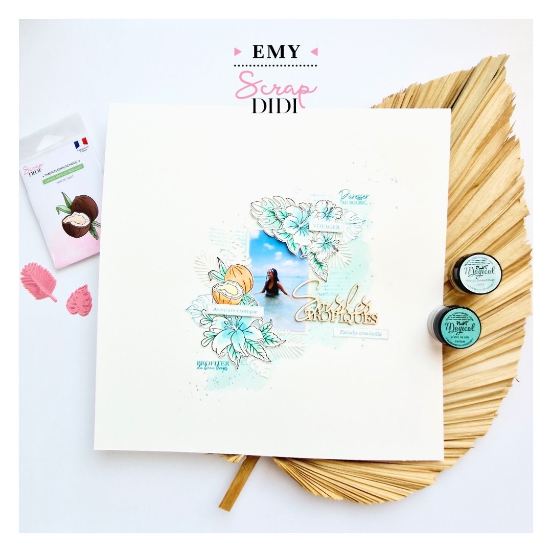 J’ai utilisé les poudres magicals « très chic » pour faire le fond de ma page mais auss pour aquareller mes tamponnages fleurs, feuillages et noix de coco.