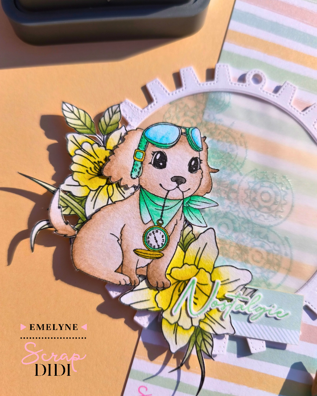 Concernant le titre, j’ai embossé à chaud le mot "nostalgie" (issu de la planche Synonyme) en utilisant la Distress Oxide Cracked Pistachio et une poudre à embosser transparente pour conserver la finesse du motif.