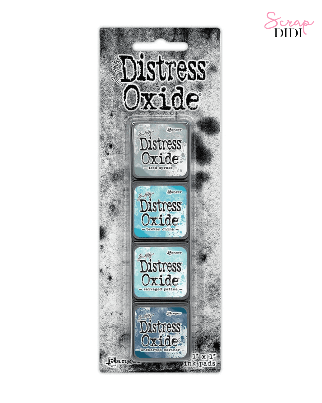 Kit 16 Distress Mini Oxide Ink Pads Tim Holtz par Ranger. 4 encres mini à effet oxydé idéales pour scrapbooking et mixed media.