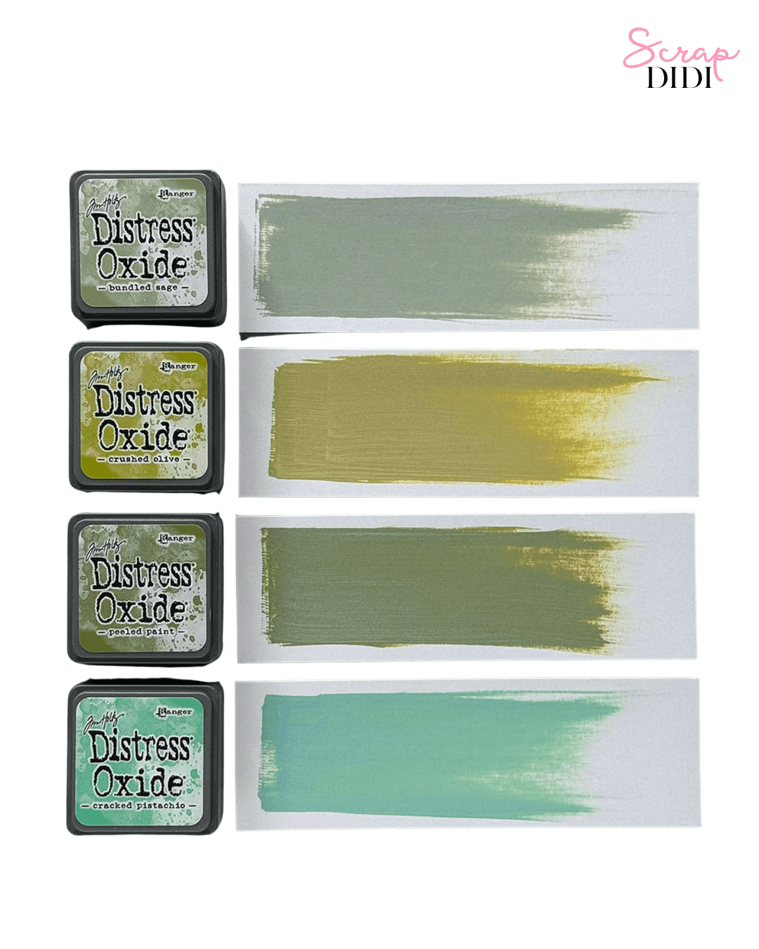 Kit 3 Distress Mini Oxide Ink Pads Tim Holtz. 4 encres : Bundled Sage, Crushed Olive, Peeled Paint, Cracked Pistachio. Effet oxydé unique.