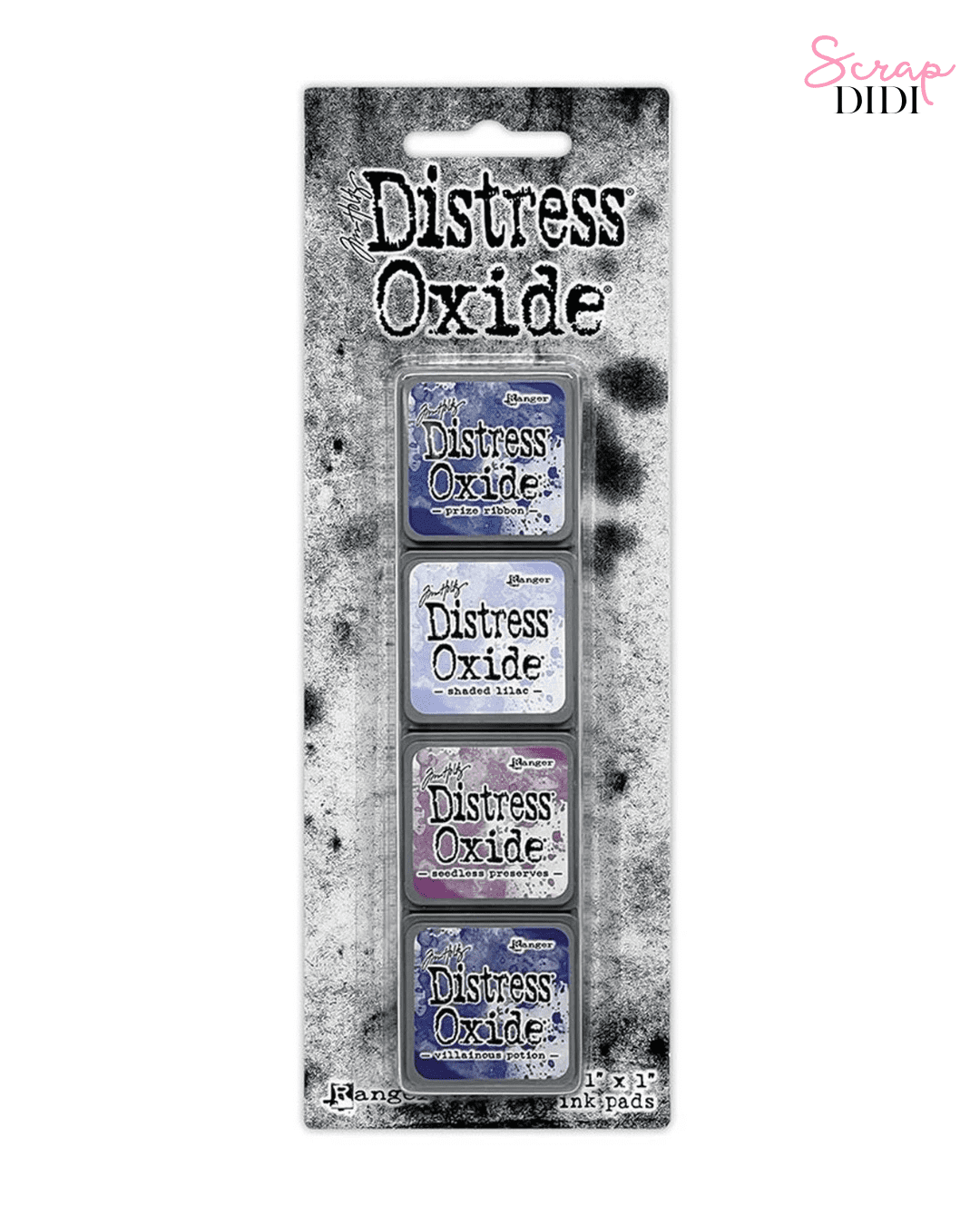 Kit 5 Distress Mini Oxide Ink Pads Tim Holtz. 4 encres : Prize Ribbon, Shaded Lilac, Seedless Preserves, Villainous Potion. Effet oxydé unique.