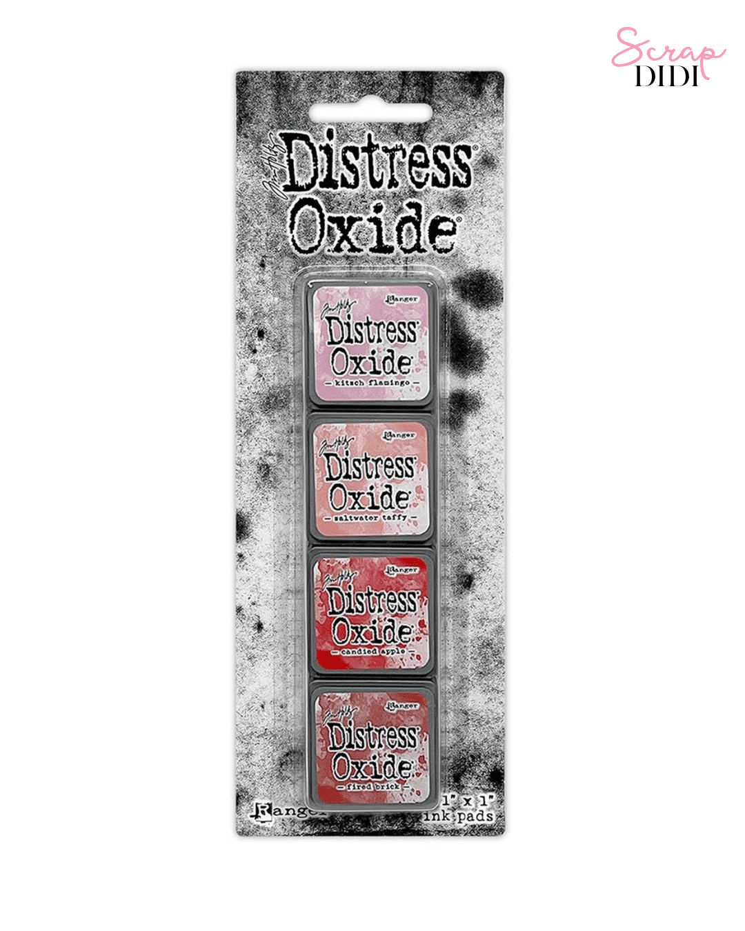 Kit 7 Distress Mini Oxide Ink Pads Tim Holtz. 4 encres : Kitsch Flamingo, Saltwater Taffy, Candied Apple, Fired Brick. Effet oxydé unique.