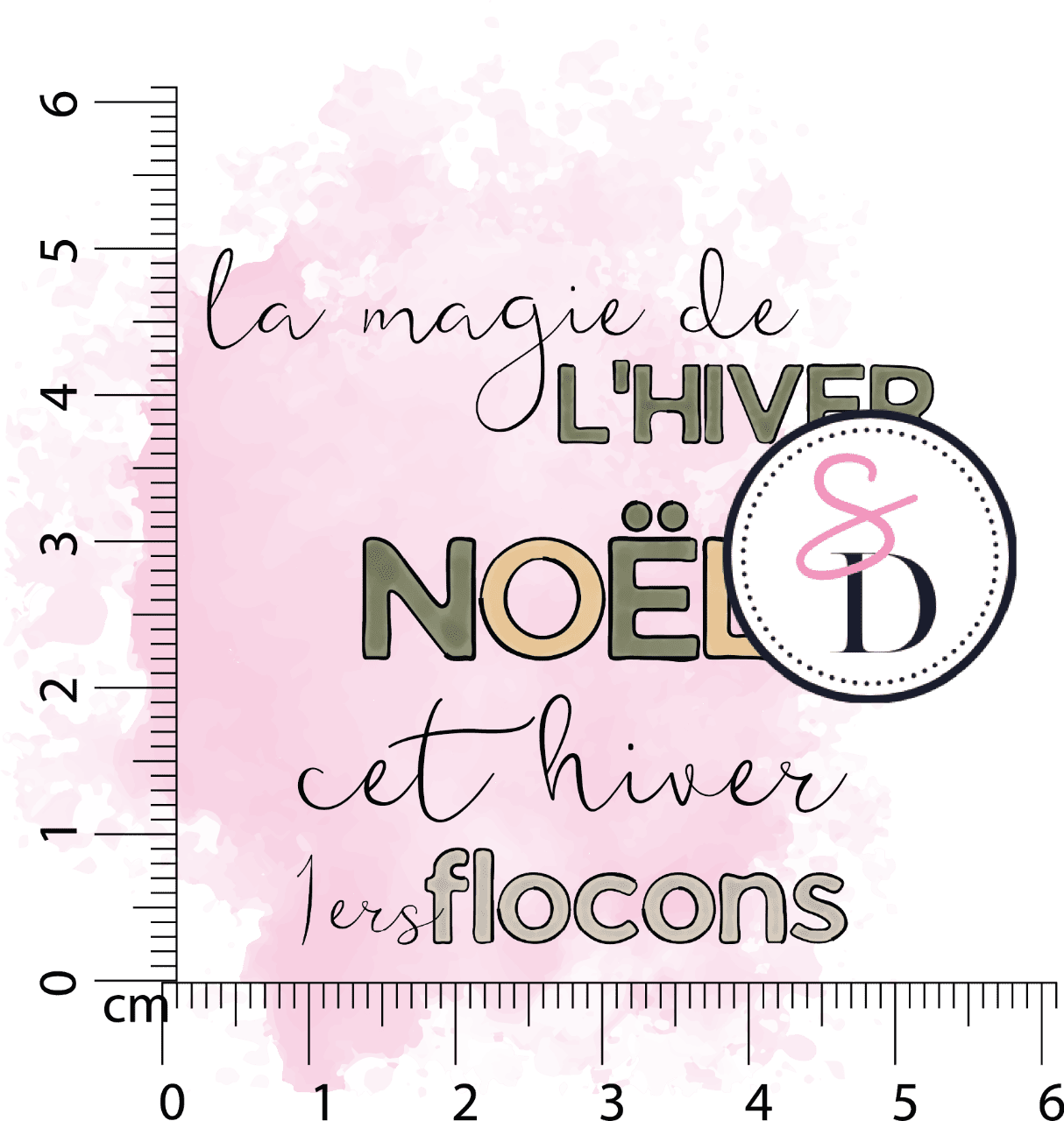 La magie de l'hiver : 5 cm x 1,3 cm / NOËL : 2,9 cm x 1,1 cm / cet hiver :3,7 cm x 0,9 cm / 1ers flocons : 3,8 cm x 0,7