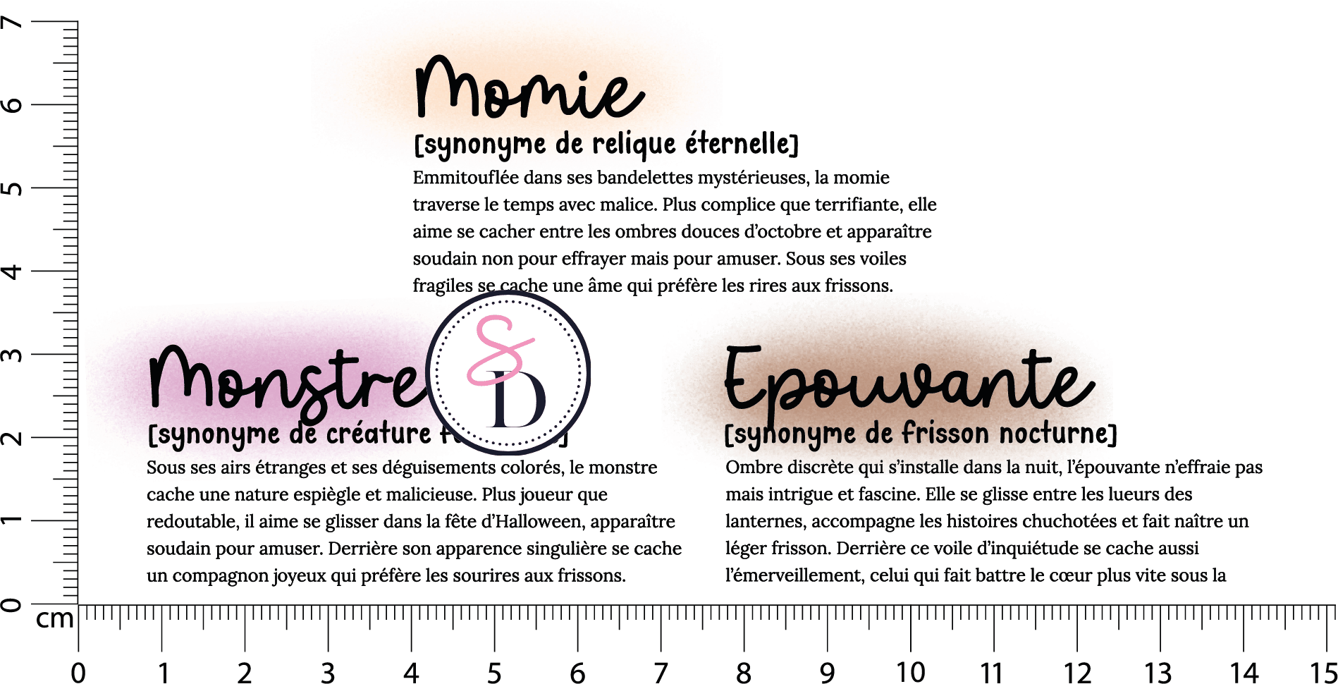 Le tampon “Synonymes” est un incontournable pour les amateurs de créations texturées et poétiques. Il se marie parfaitement avec les autres produits de la capsule Doux Frissons (Fleurs Fantômes, Joyeux Halloween, Lettre Définition S : Sortilège, etc.) pour composer des pages harmonieuses et expressives.