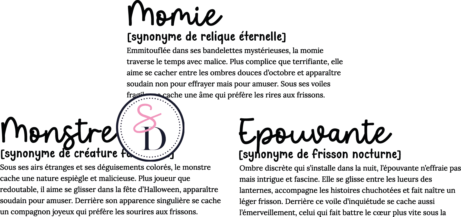 Le motif “Synonymes” présente un ensemble de mots et définitions autour du thème de la douceur, des émotions et des petits bonheurs — un design typographique idéal pour créer des fonds subtils ou apporter de la texture à vos compositions. Il s’intègre à merveille dans l’univers poétique, automnal et légèrement mystérieux de la capsule Doux Frissons.